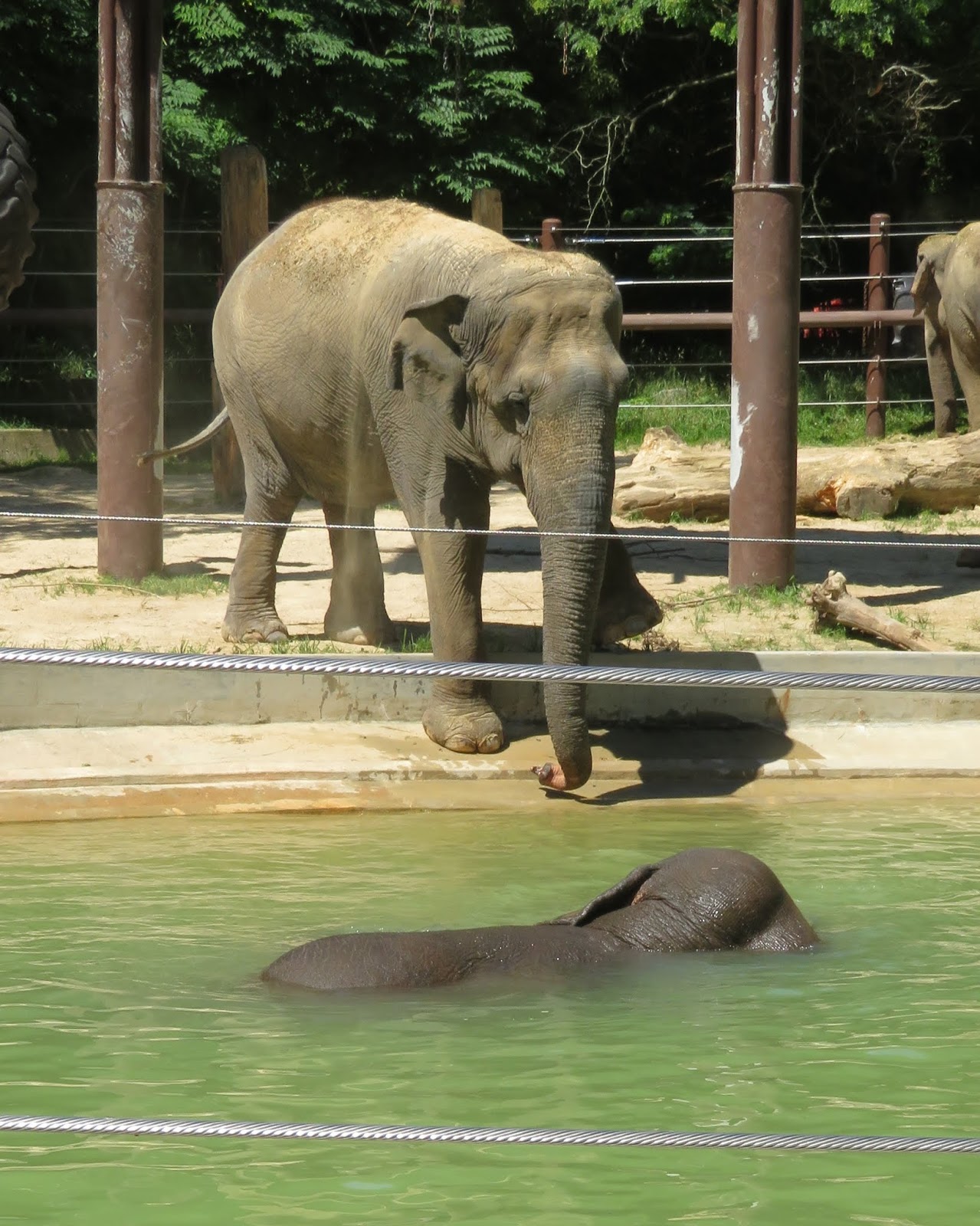 In recent years there has been a lot of consideration given to the keeping of elephants at zoos. Some institutions have removed elephants from their collection (the Virginia Zoo, the Nashville Zoo, The Philadelphia Zoo, The Woodland Park Zoo in Seattle) while other zoos have spent millions to expand and upgrade their facilities. The Smithsonian National Zoo is in the latter camp. At the time of the completion of the new facility only two of the herd, both aging females were kept, but quickly there numbers increase with the arrive of another older female from a zoo in Baton Rouge, Louisiana. Then 3 more elephants came from the Calgary Zoo in Canada (another zoo to end its keeping of elephants) creating a herd of sixth females. Five of this animals are considered too old or have other issues that would make breeding them ill advised. The sixth is a young female, Maharani, and this year she was joined by a male, Spike who came from a zoo in Florida. Who knew that elephants live such cosmopolitan lives.Maharani coyly hanging out in a nearby wading pond in the shade.
