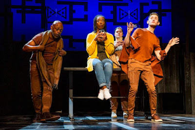 While the stage setting seemed simple (just as the lights dimmed and the buzz in the audience hushed, a patron sitting across the aisle to my right said, "It's not much a set, is it?") at first glance, from the first moment it proved to be an amazing mixture of design concept and lighting that engaged everyone in an instant (even the old bird on my right!) Kudos to Scenic Designer Sim Carpenter, and Lighting Designer Sherrice Mojgani--and ALL of the carpenters and electricians and artists who brought those designs to life.