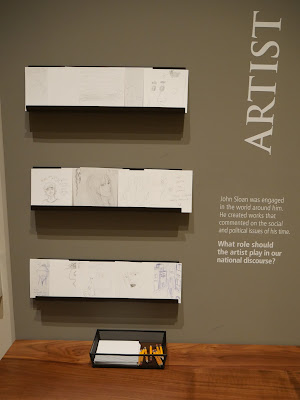 On the left wall, are a series of works by John Sloan, many of which are nocturnes. And on the opposite wall are works on paper, drawings with social and political themes by Sloan who also worked as a political cartoonist, and contemporaries. Here there is also a desk with pencils and squares of paper inviting visitors to make little drawings of their own and then place them in racks for others to enjoy. This type of guest engagement can be found in other places in the museum. It's one of the aspects of the DAM that I really love. It's an intimacy that befits a museum of this size.