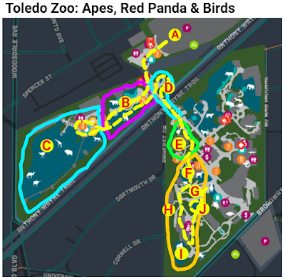 On the far side was a children's play area--with a Blue Crab statue (G)! Loved it. For those by-passing the fun, and large long habitat (H) with Cinereous Vultures (Aegypius monachus) a species completely new to me and one that the Toledo Zoo has some success breeding as part of an AZA SSP (Species Survival program) and Hadada Ibis (Bostrychia hagedash) led you on to the Great Apes.